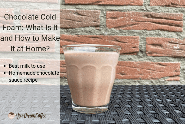 Chocolate cold foam is a thick and creamy foam made with low-fat milk and chocolate sauce. It’s perfect for topping your favorite iced coffees.