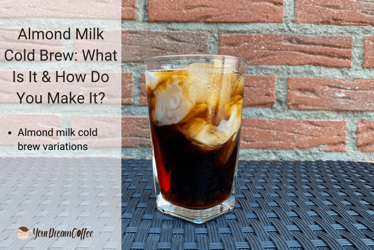 Almond milk cold brew is a coffee drink made with cold brew coffee and a splash of almond milk. It’s a refreshing, low-acid alternative to traditional hot coffee drinks and is served on ice with optional sweeteners.