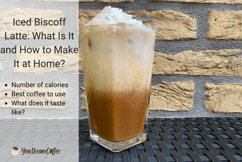 An iced Biscoff latte is a concoction of strong espresso coffee, Biscoff cookie butter spread, milk, ice cubes, and optionally a serving of whipped cream.