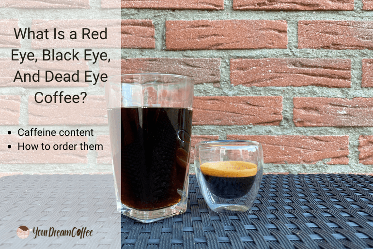 A red eye, black eye, and dead eye coffee basically mean how much caffeine you want in your cup of brewed coffee. A red eye coffee has one shot of espresso added, the black eye has two shots, and the dead eye has three whole espresso shots!